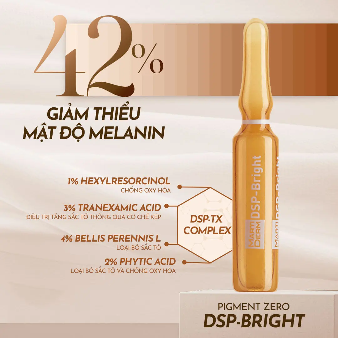 MartiDerm Pigment Zero DSP-Bright là ampoule làm sáng da và điều trị đốm sắc tố mạnh mẽ đến từ thương hiệu MartiDerm, được thiết kế dành cho tình trạng tăng sắc tố và da không đều màu. Công thức chứa 6 thành phần điều trị đốm sắc tố khác nhau được phối trộn và cô đặc trong 1 loại ampoule duy nhất để mang lại hiệu quả tối đa, giúp loại bỏ đốm sắc tố, đồng thời ngăn ngừa sản sinh và tích tụ melanin trong da, từ đó làm giảm kích thước và mật độ của các đốm nâu, dưỡng da sáng mịn đều màu.