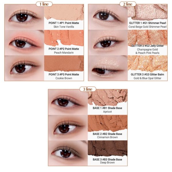 Kết cấu: Bảng phấn bao gồm tổng cộng 9 ô, có đủ cả chất phất nhũ và phấn lì cho bạn tha hồi phối màu và chọn lựa thật nhiều phong cách cho bản thân