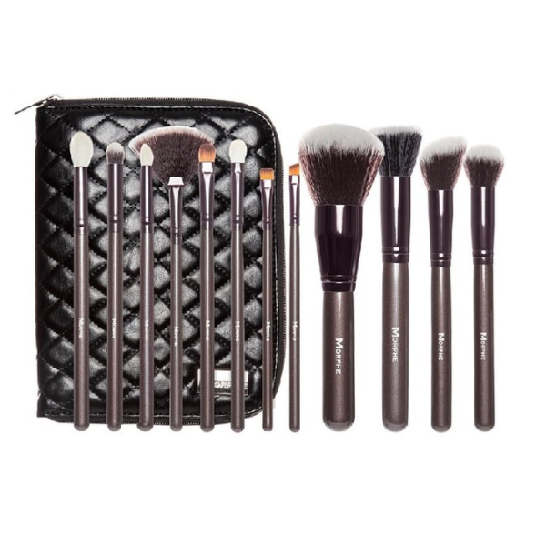 -Là một trong những set cọ đẹp nhất của hãng Morphe, gồm 12 cọ trang điểm chuyên nghiệp với thiết kế đồng nhất màu thiếc cực đẹp và cá tính, đi kèm với ví da sang trọng. Lông cọ từ chất liệu thiên nhiên và nhân tạo cao cấp.