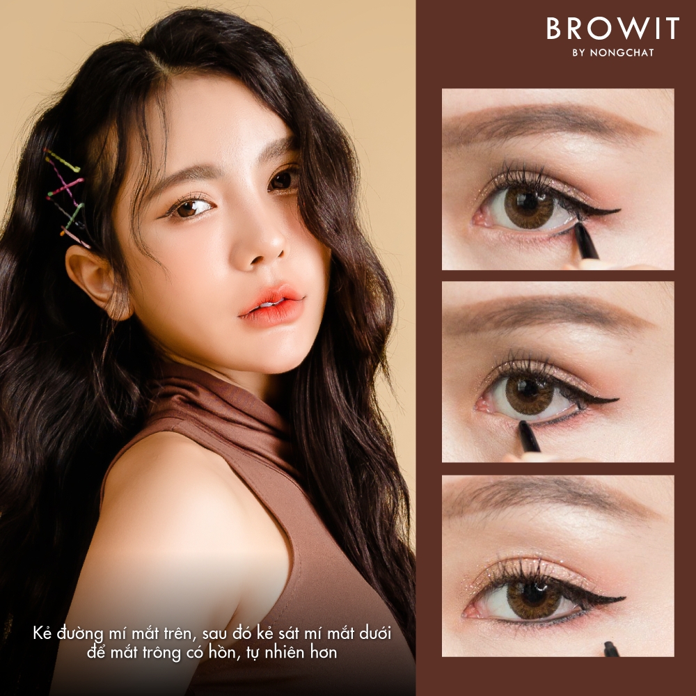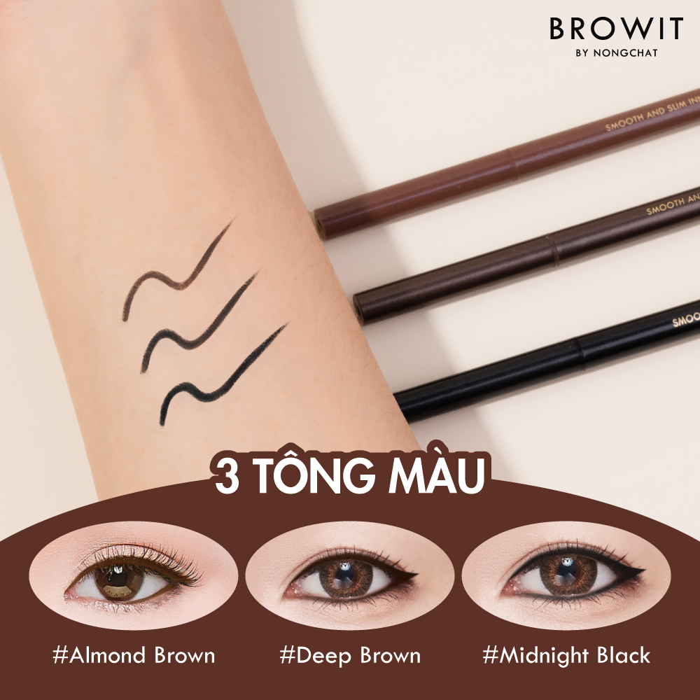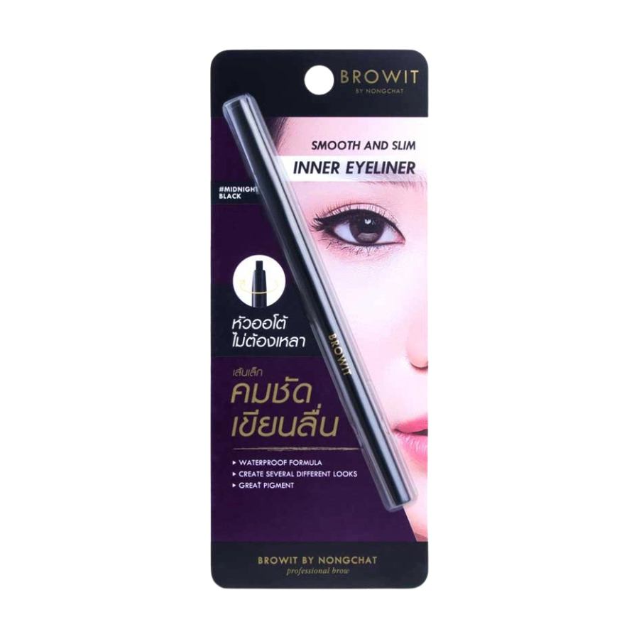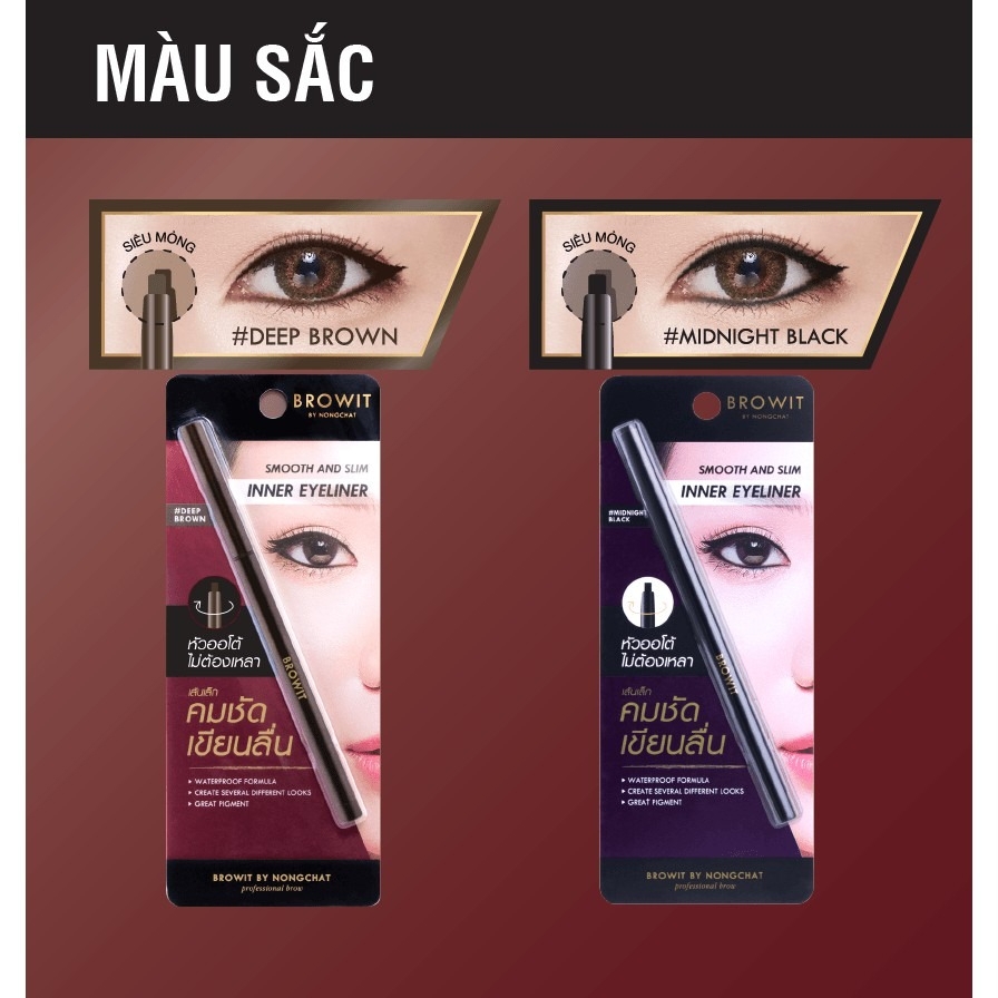 Chì Sáp Kẻ Mắt Không Lem, Không Trôi Nongchat Smooth And Slim Inner Eyeliner 0.1g là sản phẩm kẻ mắt đến từ thương hiệu mỹ phẩm Browit của Thái Lan, thiết kế dạng sáp với đầu bút nhỏ chỉ 2 mm thao tác dễ dàng, đường kẻ sắc nét, đậm màu và có khả năng không thấm nước, mồ hôi cao. Sản phẩm đồng sáng tạo bởi NongChat – chuyên gia trang điểm hàng đầu tại Thái Lan.