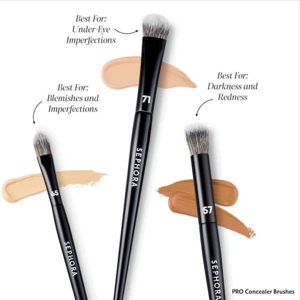 – Cọ Sephora 57 : Cọ che khuyết điểm với thiết kế không khác gì một cọ nền dạng buffing thu nhỏ, giúp cho lớp kem che khuyết điểm được blend đều cho vùng da dưới mắt, dàn trải lớp kem che khuyết điểm giúp cho đôi mắt bừng sáng hơn.