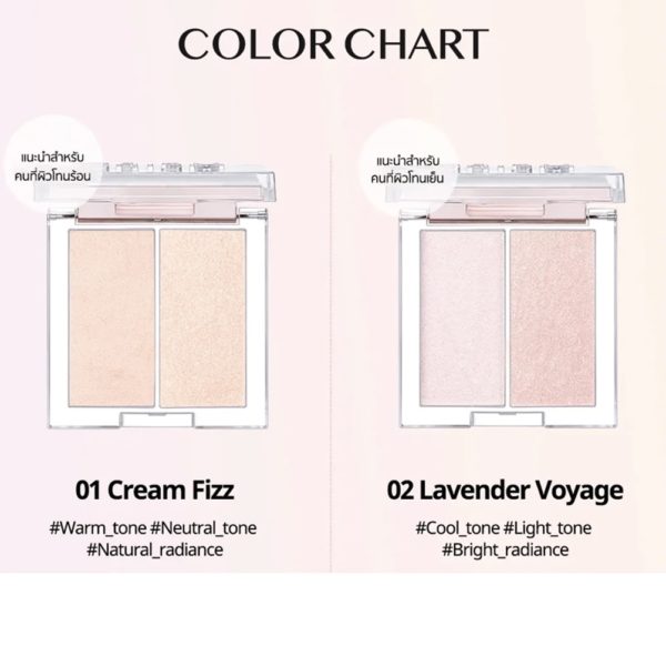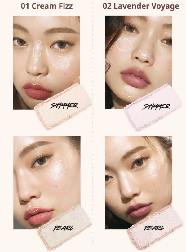 – Bộ đôi phấn highlight kết hợp ánh nhũ sáng lấp lánh và ánh ngọc trai giúp tạo điểm nhấn, làm nổi bật khuôn mặt.