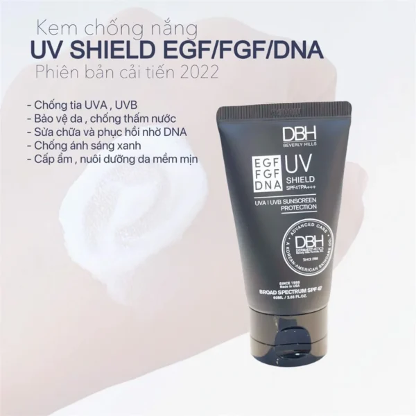 Kem chống nắng DBH EGF UV Shield SPF47 PA+++ là dòng dành cho làn da nhạy cảm nhất. Bí quyết cho làn da không tuổi, là kem chống nắng duy nhất có chứa EGF ( chất tăng trưởng biểu bì ) có 3 chức năng chống nắng, làm căng bóng da, dưỡng da. Kem chống nắng DBH sở hữu công nghệ đột phá của MỸ giúp làm đều màu da, che khuyết điểm vượt trội, cho bạn làn da tươi sáng, rạng rỡ mỗi ngày.