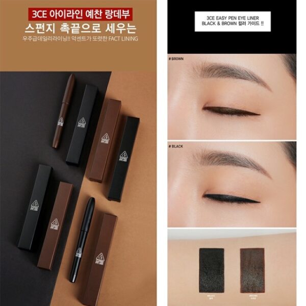 3CE EASY PEN EYELINER với thiết kế dặc biệt tạo nên những đường kẻ mắt thanh mảnh giúp cho đôi mắt rõ nét và sâu hơn.