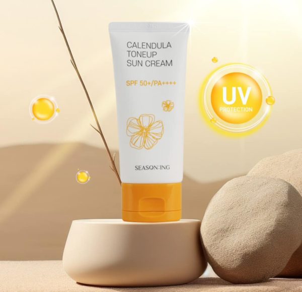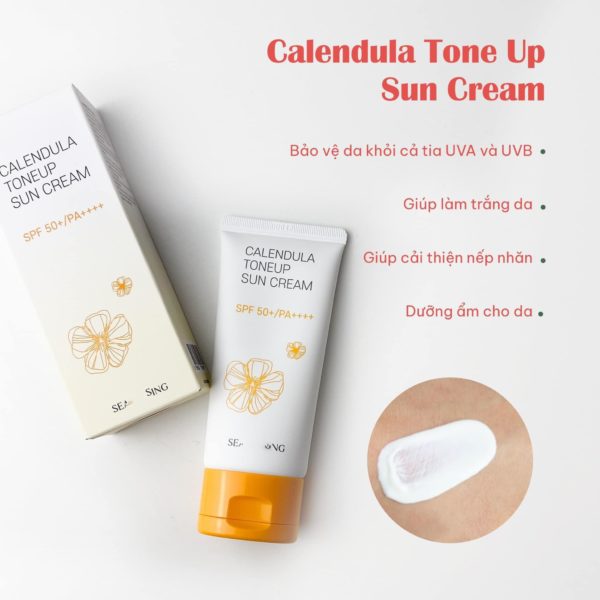 Kem chống nắng Seasoning Calendula Toneup Sun Cream SPF50 dạng gel cream mỏng nhẹ, nâng tone tự nhiên. Kem chống nắng phổ rộng với chỉ số SPF50+ giúp làn da chống nắng lên đến 98% và PA++++ bảo vệ làn da xuyên suốt từ 8-12 giờ.