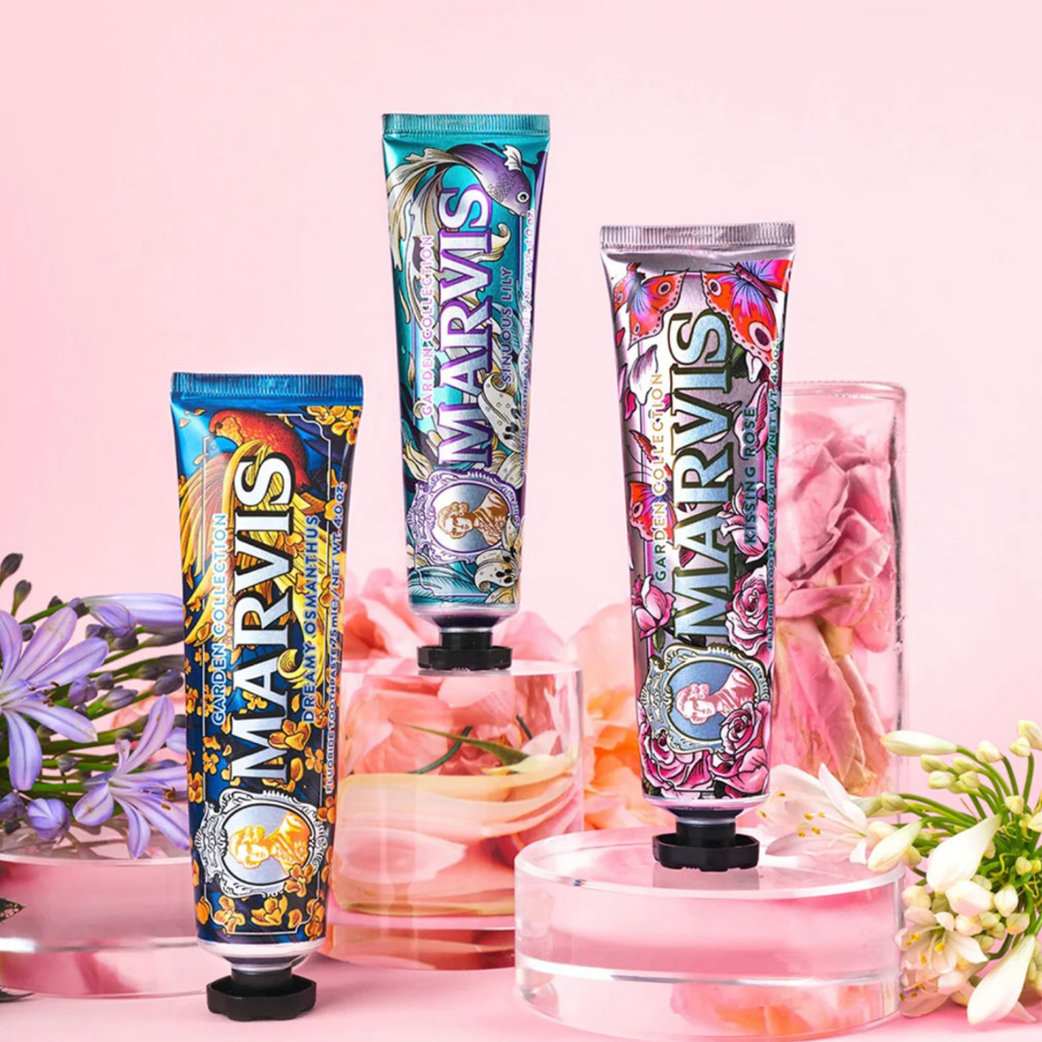 • Kem Đánh Răng Marvis Dreamy Osmanthus Garden Collection Toothpaste 75ml: Bạc hà châu Âu kết hợp cùng hương hoa mộc tê thanh tao, dịu dàng.