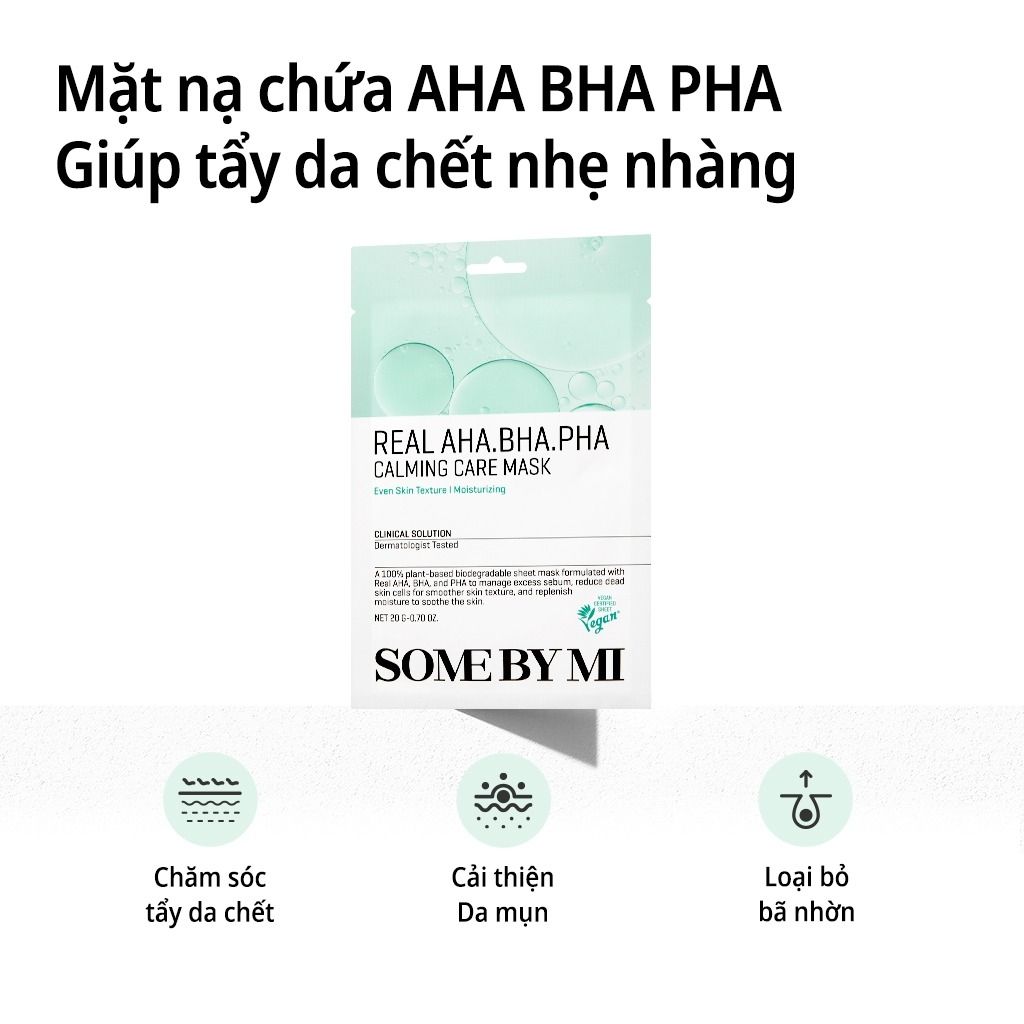 Mặt nạ dưỡng da Some By Mi Real AHA-BHA-PHA Calming Care Mask có chứa thành phần AHA-BHA-PHA giúp làm sạch tế bào chết dịu nhẹ từ đó giúp da trở nên mềm mịn hơn.