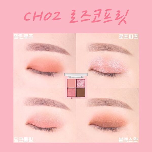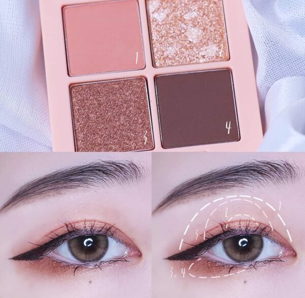 – 2 màu matte có chứa các thành phần giúp phấn mắt lâu trôi trong thời gian dài, 2 màu pha lê lấp lánh chứa dầu cho độ bám dính cao và lâu dài
