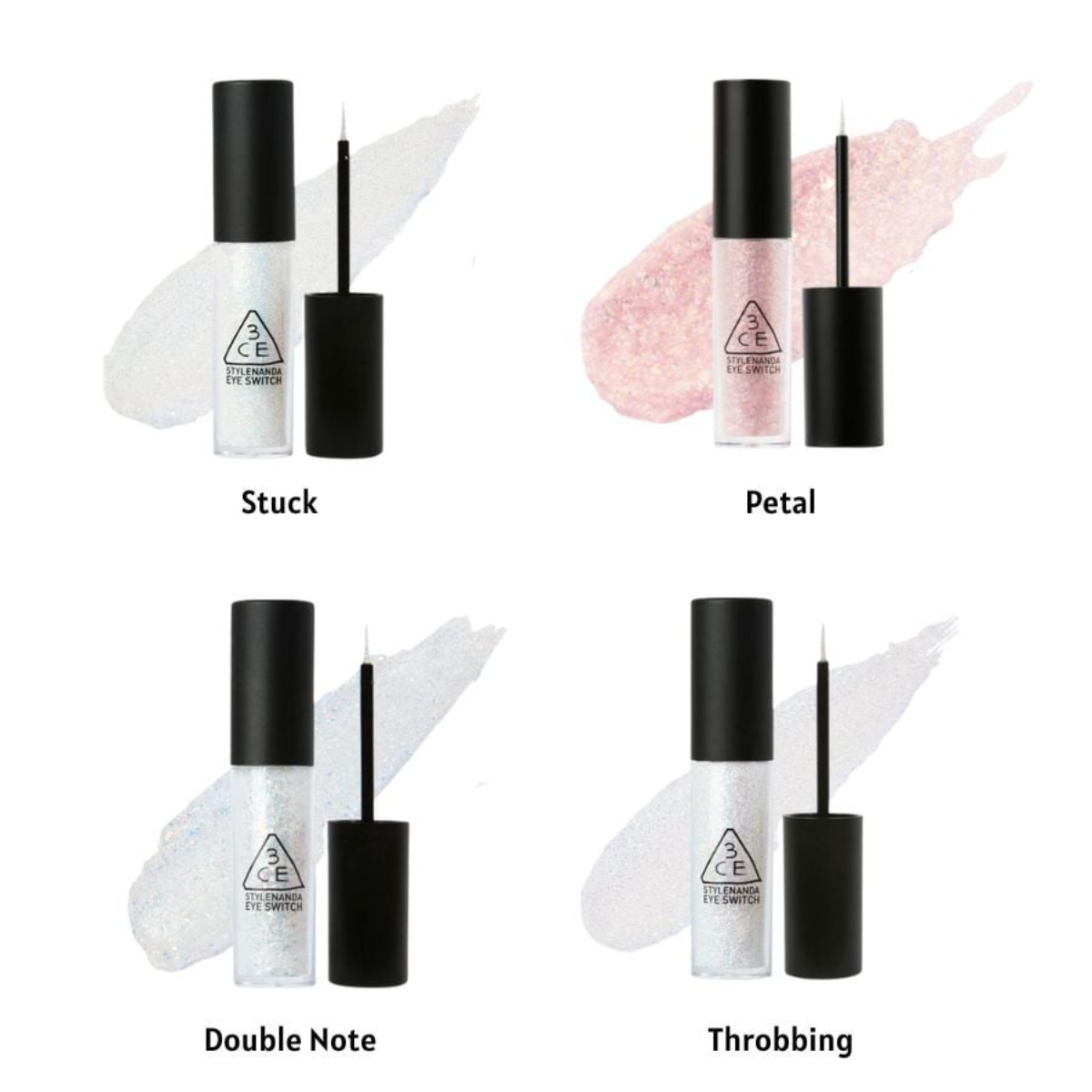 Nhũ mắt 3CE Eye Switch có bộ sưu tập 5 màu mắt khá trẻ trung, thích nghi được với nhiều phong cách cho bạn tha hồ lựa chọn đến từ thương hiệu 3CE. Đây đều là những màu sắc khá tươi tắn như màu vàng be, hồng… cực kỳ thích hợp với giới trẻ và làn da phụ nữ châu Á. Những màu mắt này tất cả đều có nhũ kim tuyến cho đôi mắt bạn long lanh hơn khi sử dụng. Ngoài ra, những màu mắt này còn có thể pha trộn với nhau để sử dụng cho nhiều dịp khác nhau với màu sắc ấn tượng hơn. Sản phẩm có thể dùng hằng ngày khá thanh lịch nhưng cũng có thể biến hóa để giúp bạn nổi bật nhất trong những cuộc vui đông đúc.
