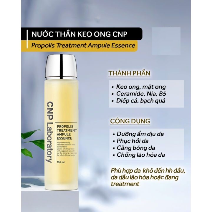 Nước Thần Keo Ong Phục Hồi Da CNP Laboratory Treatment Ampule Essence với thành phần keo ong giúp kháng khuẩn, có tác dụng hồi phục nhanh làn da bị tổn thương và giúp da căng bóng, mượt mà, làm mềm da, dưỡng ẩm, làm dịu da, kìm hãm hoạt động của các gốc tự do, kiểm soát lượng dầu thừa.
