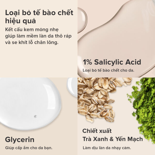 Hoàn toàn dịu nhẹ, không chứa tính bào mòn, loại bỏ tế bào chết sâu bên trong lỗ chân lông Nhờ thành phần Salicylic Acid, axit gốc dầu đi sâu dưới da, quét sạch dầu thừa da chết kết hợp dưỡng da, không khô hay kích ứng Giảm mụn viêm sưng, cải thiện bề mặt da do mụn và hạn chế phát sinh thêm vấn đề da khác.