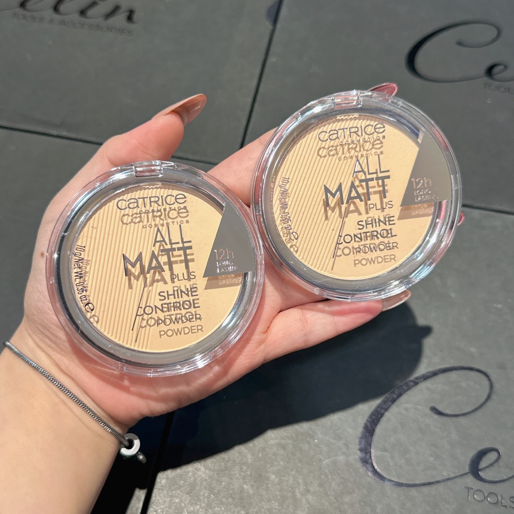 - Bước 1: Sau khi đã hoàn thành lớp trang điểm kem lót và kem nền, dùng cọ/mút trang điểm lấy một lượng vừa đủ sản phẩm Phấn phủ Catrice All Matt Shine Control Powder.