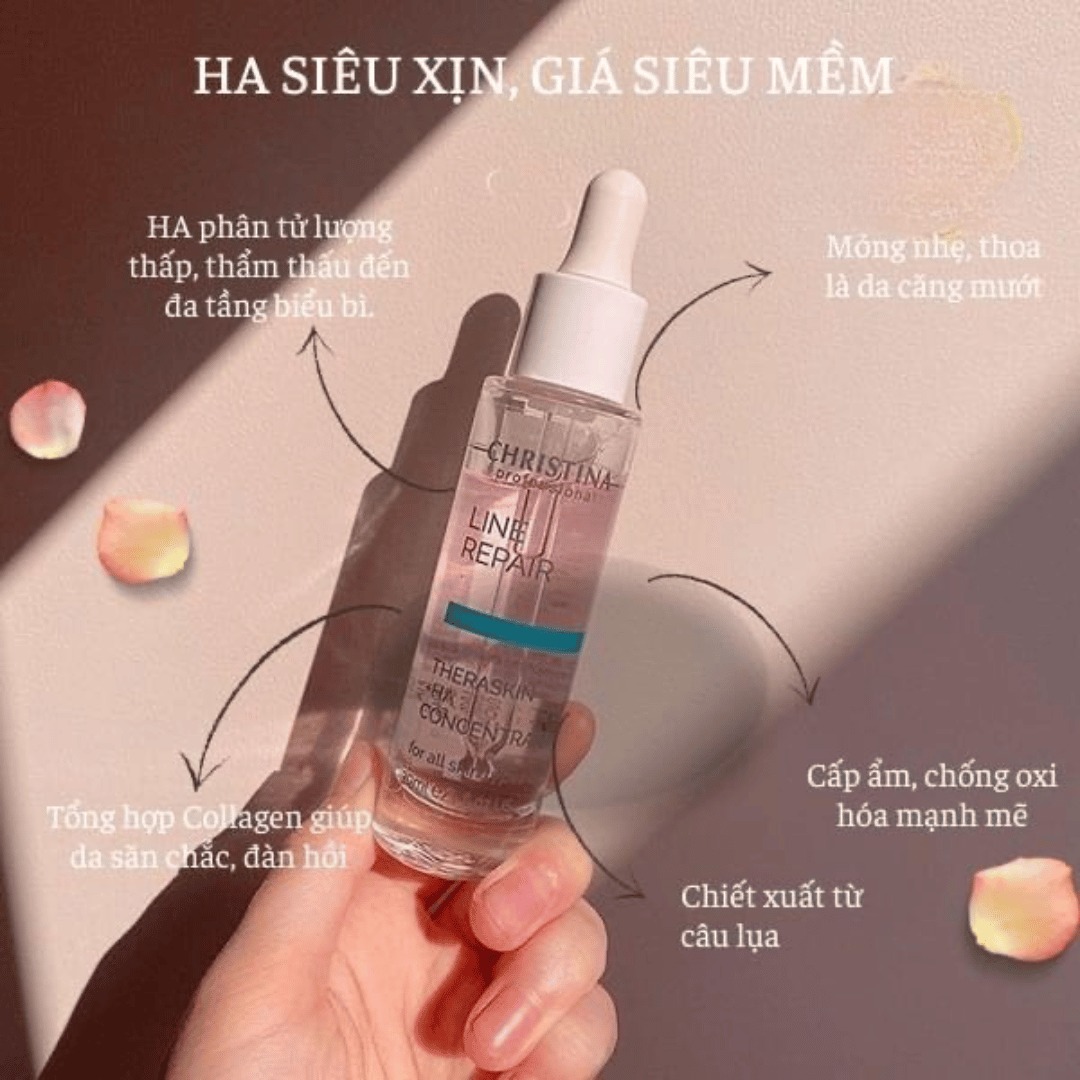 Serum Christina Line Repair HA plus 50ml được đóng gói dựa trên công nghệ độc quyền đã được cấp bằng sáng chế. Hyaluronic Acid giúp thâm nhập vào các lớp da sâu bên dưới để hoạt động hiệu quả. Các lớp Hyaluronic Acid của viên nang dần dần mở ra và giải phóng định kỳ Hyaluronic Acid một cách có kiểm soát giúp mang lại hiệu quả lâu dài. Line Repair – Theraskin + HA Concentrate giúp bổ xung nồng độ HA cao trong da, giúp làm đầy các nếp nhăn và vết chân chim, mang đến làn da trẻ trung, mịn màng, tươi sáng và căng mướt trong vòng một giờ.