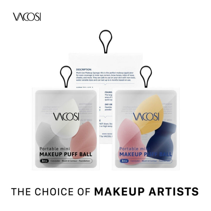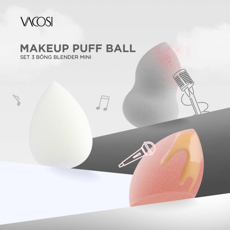Vacosi Set 3 bông Mini Blender PH05-01 Phiên bản “tí hon” của chiếc mút trang điểm VACOSI – không chỉ xinh xắn đáng yêu mà còn đa dạng về kiểu dáng với công dụng: tán nền, má hồng, tạo khối…