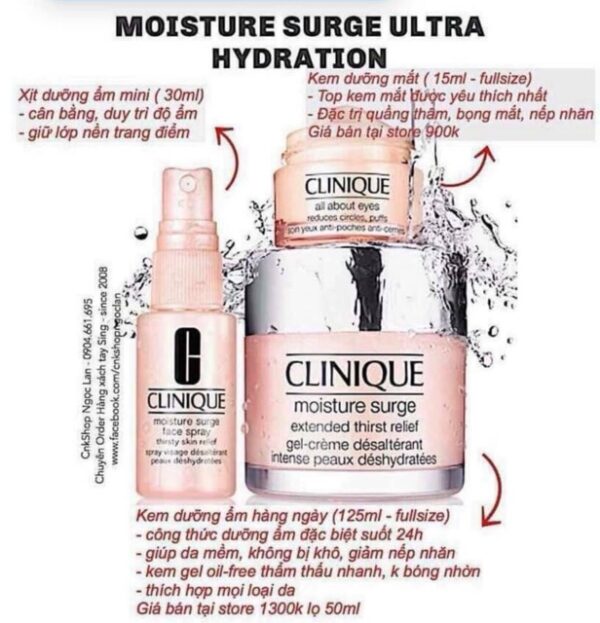 Set Dưỡng Ẩm Clinique Moisture Surge 72H là sản phẩm thuộc hãng mỹ phẩm danh tiếng Clinique, một bộ gồm 3 sản phẩm: