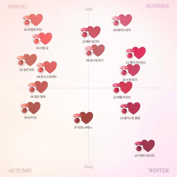 – Cool tone: 08: Hồng lạnh tươi, hợp da trắng. 09: Hồng tím pha ánh tím. 10: Hồng tím nghiêng hồng, rạng rỡ. 11: Hồng tươi lạnh, da trắng dùng siêu đẹp. 12: Hồng đất dễ dùng, được yêu thích nhất. 13: Tone đậm nhất bảng. 14: Đỏ hồng lạnh, hợp da ngăm. 15: Hồng plum tím, tone winter dark.