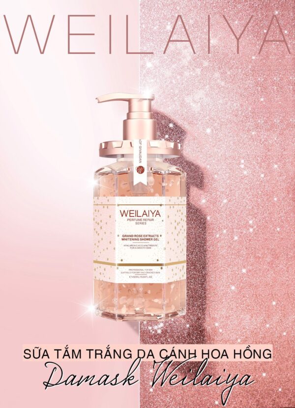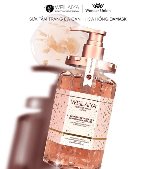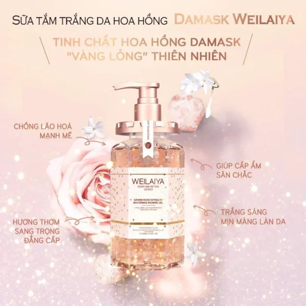 Sữa tắm Weilaiya Grand Rose Extracts Whitening Shower Gel chiết xuất cánh hoa hồng tự nhiên nhập khẩu từ Bulgaria được chọn lọc kỹ lưỡng giúp điều tiết cân bằng lượng nước và dầu, dưỡng ẩm và làm đẹp da.Ggiàu axit amin, tinh chất rau má, Sodium Hyaluronate giúp dưỡng ẩm sâu, làm sạch nhẹ nhàng, chống oxy hóa và bảo vệ màng chắn của da.