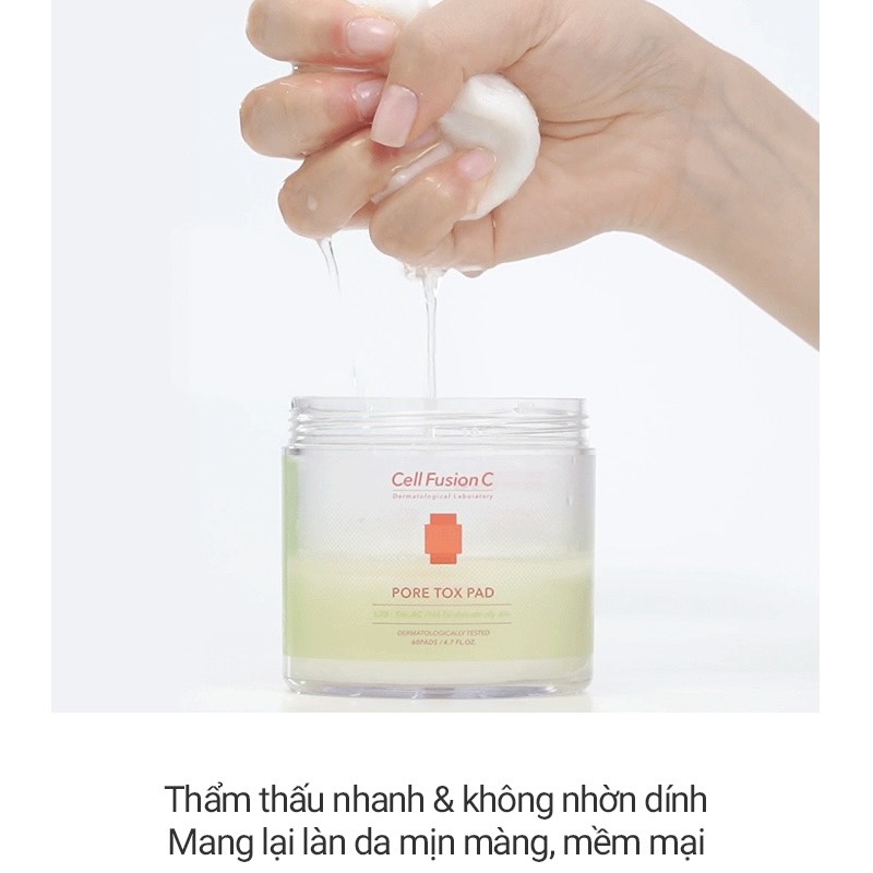 – Nhờ chiết xuất từ thiên nhiên, toner pad giúp giảm tình trạng mẩn đỏ, hạn chế viêm sưng, đồng thời hỗ trợ cải thiện mụn đầu đen, mụn ẩn. Cell Fusion C PORE TOX Pad chỉ cần 1 miếng pad thay thế cho bước toner và bông tẩy trang truyền thống, vừa tiết kiệm thời gian vừa đảm bảo da sạch sâu, sẵn sàng cho các bước skincare tiếp theo.
