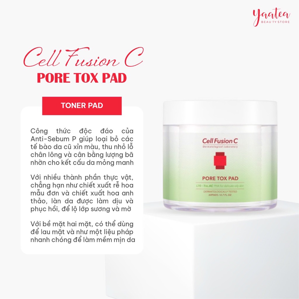 Toner Pad Dưỡng ẩm, Kiềm Dầu Cell Fusion C PORE TOX Pad là dòng toner pad thế hệ mới, được thiết kế dạng bông cotton thấm sẵn tinh chất, giúp làm sạch sâu, kiểm soát dầu thừa và cải thiện bề mặt da mịn màng. Không chỉ làm dịu da mà còn hỗ trợ cân bằng độ ẩm, mang lại làn da thông thoáng, săn chắc và rạng rỡ.